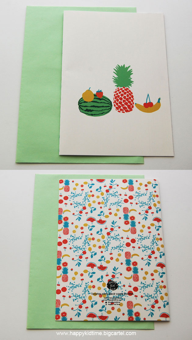 Para un verano divertido y lleno de fruta de temporada, 3 tarjetas con la frase que repetimos continuamente a nuestros niños "Come fruta". Podrás comprarlas en un paquete de 3 tarjetas.